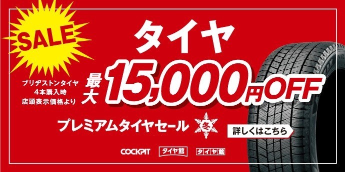 タイヤが最大¥15,000引きとなるクーポンを予定しております。
