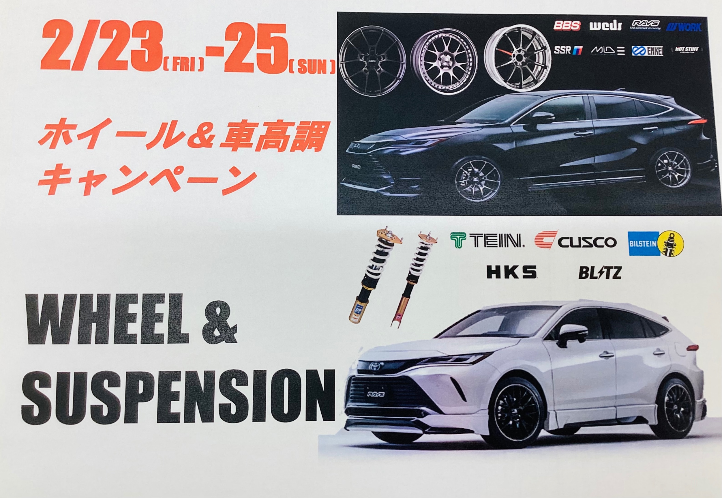 2/23〜25日 ホイールキャンペーンを開催します! ポスト 2024年2月10日 こんにちは! 今回はホイールキャンペーンのご案内です (・∀・)ノ 2月23〜25日の三日間、ホイールメーカーさん協賛のもとホイールキャンペーンを開催いたします! 今回ご協力いただいたのは Wedsさん と 共豊コーポレーションさんです! イベント期間中は店内にて特別展示を行いますので、ホイール交換をお考えの方はぜひ一度お越しくださいね \(・∀・)/ お車の横にホイールを置いて装着をイメージできる ホイール仮当てサービス も実施していますよ♪ 皆様のご来店お待ちしております! カテゴリ:お知らせ