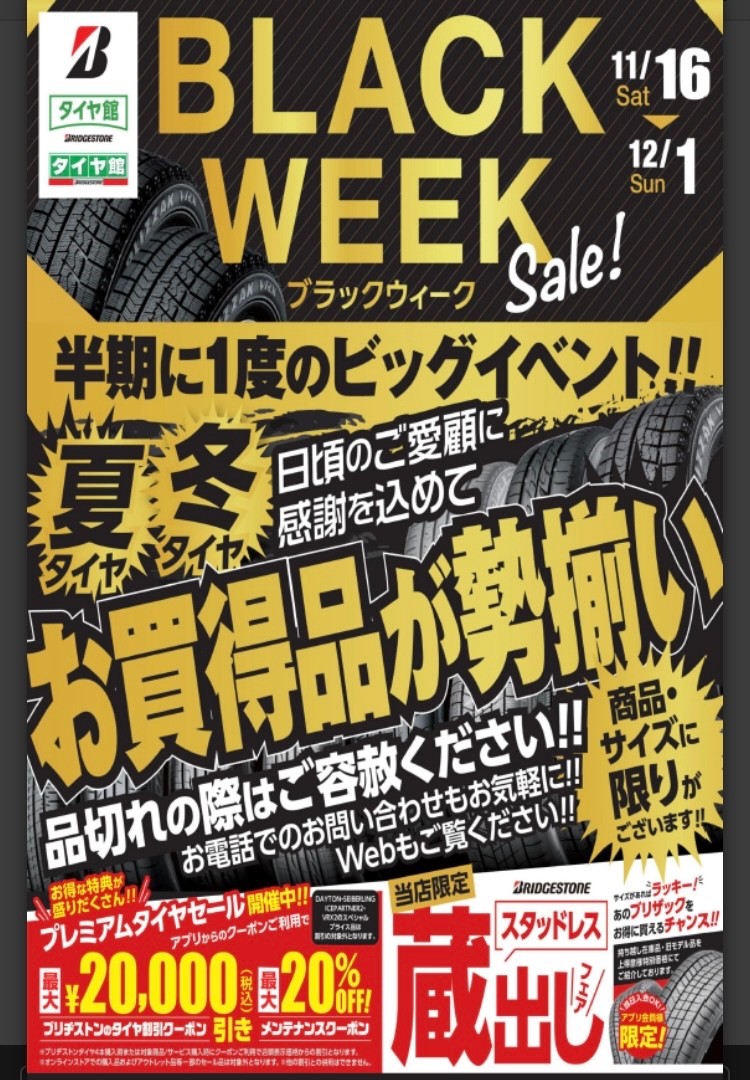 ⭐︎ブラックウィーク開催します!2024年11月16日(土)~ ポスト 2024年11月14日 タイヤ館倉敷大島店です(^^)/ いつもホームページ閲覧ありがとうございます♪ ⭐︎ブラックウィーク開催します!2024年11月16日(土)~ SALE開催期間: 2024年11月16日(土)~12月1日(日) タイヤもお買い得‼‼‼ アルミホイールやメンテナンス品も 大変お買い得な期間です‼‼ 詳しくは店頭にて!!! タイヤ館 倉敷大島 住所:710-0047岡山県倉敷市大島128-1 電話番号: 086-425-6411 タイヤ点検・安全点検/タイヤ履き替え/オイル交換/その他ピット作業の予約 担当:片山