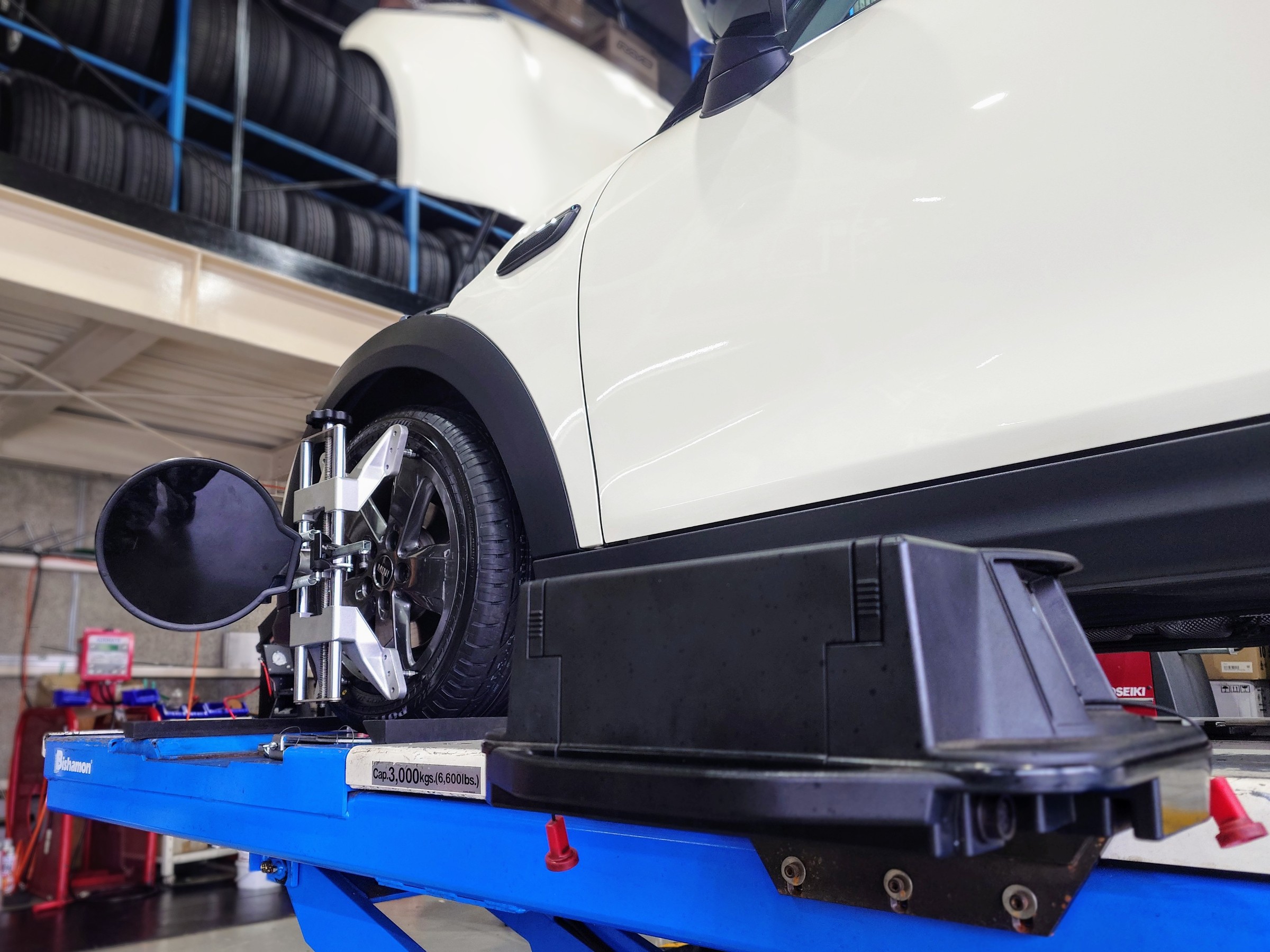 ミニ・クーパーのタイヤ交換、アライメント調整、エアコンガスクリーニング作業を行いました!!