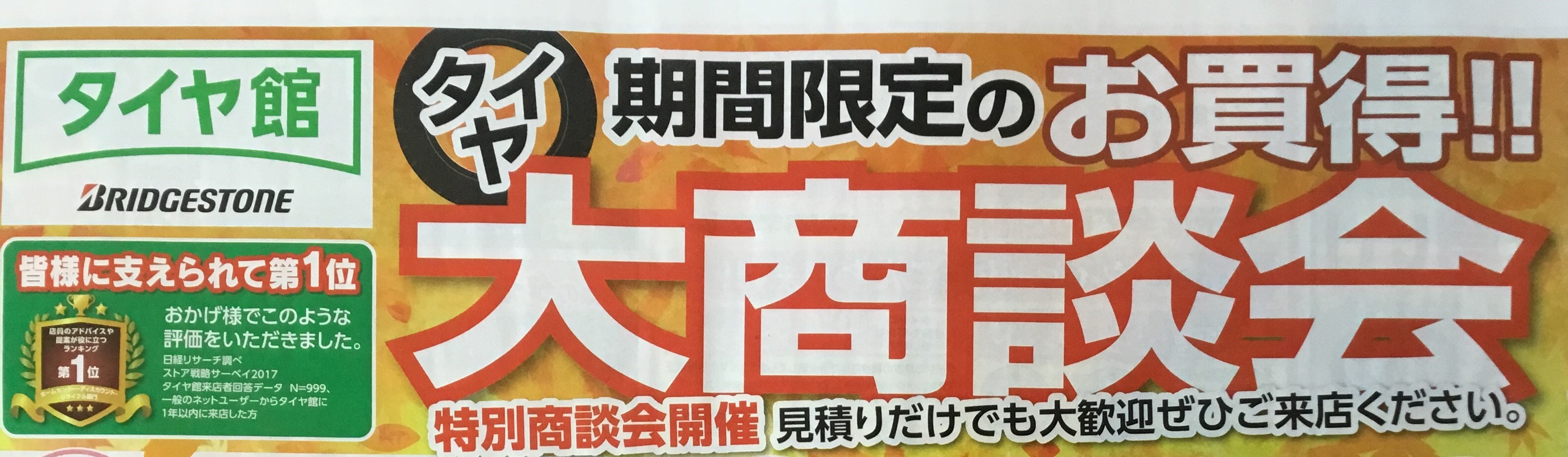 売り出しやります! ポスト 2018年10月19日 明日20日(土)~28日(日)までは、是非タイヤ館にお越しください!! タイヤ交換をお考えの方はこの期間がお得ですよ☆ そろそろ、スタッドレスタイヤの時期です! シーズンになると在庫切れになってしまうこともあるので お早目の準備おすすめです♪ スタッドレスタイヤの御予約も受付中ですよ★ タイヤ交換のついでに、エンジンオイル交換やバッテリー交換なども出来ます! お車のご用命は、タイヤ館倉敷大島店まで!!! 担当:下山