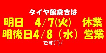 タイヤ館倉吉は 明日4/7(火)休業 明後日4/8(水)営業です。