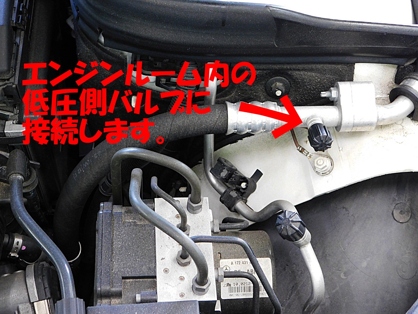 そこで、エアコンの低圧側のバルブに装着して作業開始!
