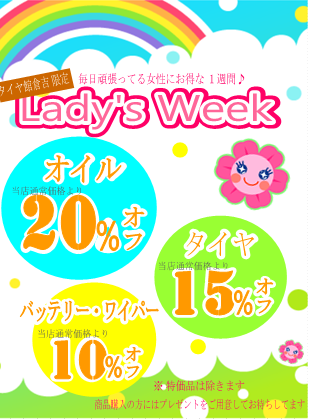 レディースデーのお知らせ♪木曜日はタイヤ・メンテ・オイルがお得♪