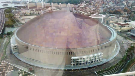 ヤフオクドーム ポスト 2014年7月10日 昨日(7月9日)下期方針説明会のため福岡に行ってきました。台風が接近中のためどうなるかと思いましたが無事日帰りできました。(岡山まで車、岡山からは新幹線。)会場がヒルトン福岡でしたのでヤフオクドームのすぐ横です。写真はヒルトン福岡とヒルトンの34階から見たヤフオクドームの写真です。上から見ることはなかなかないので写真を撮ってきました。ガラスに反射で自分が写ってしまったのが残念! 担当:永田