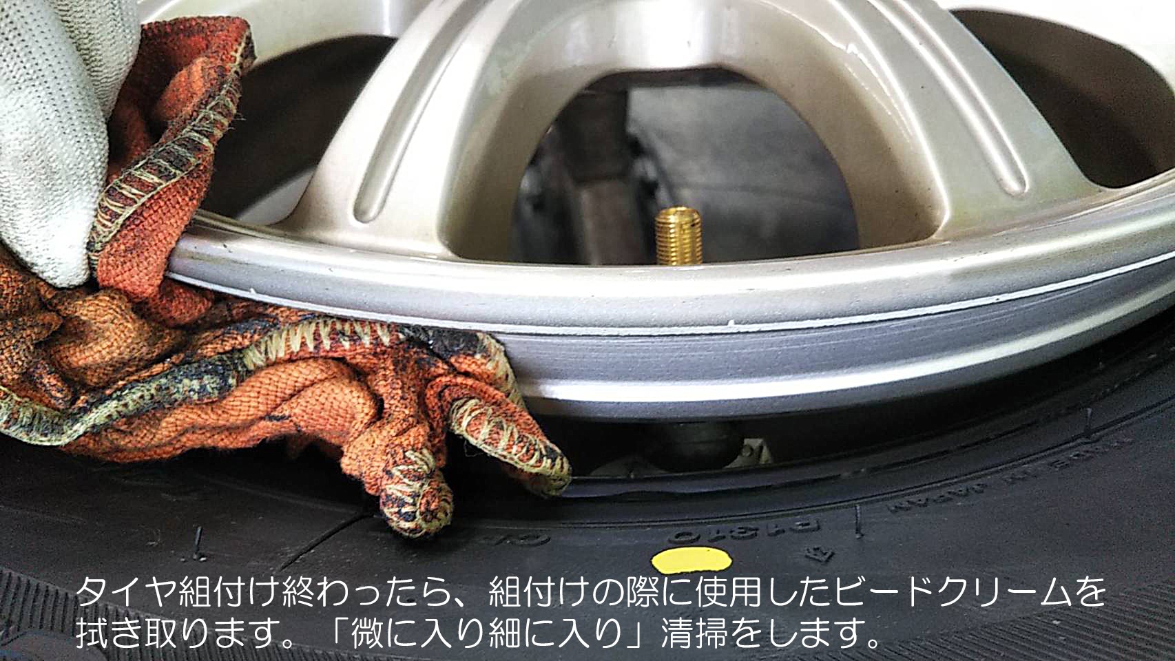 バルブ交換をして新しいタイヤを組み付けますが、組付け終わったホイールとタイヤにはビードクリームが残っています。