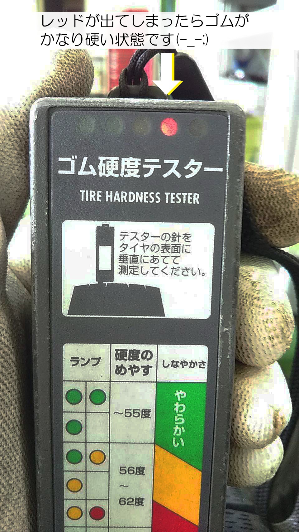 そこで硬度計という、タイヤの堅さを計る機械で計測したところ