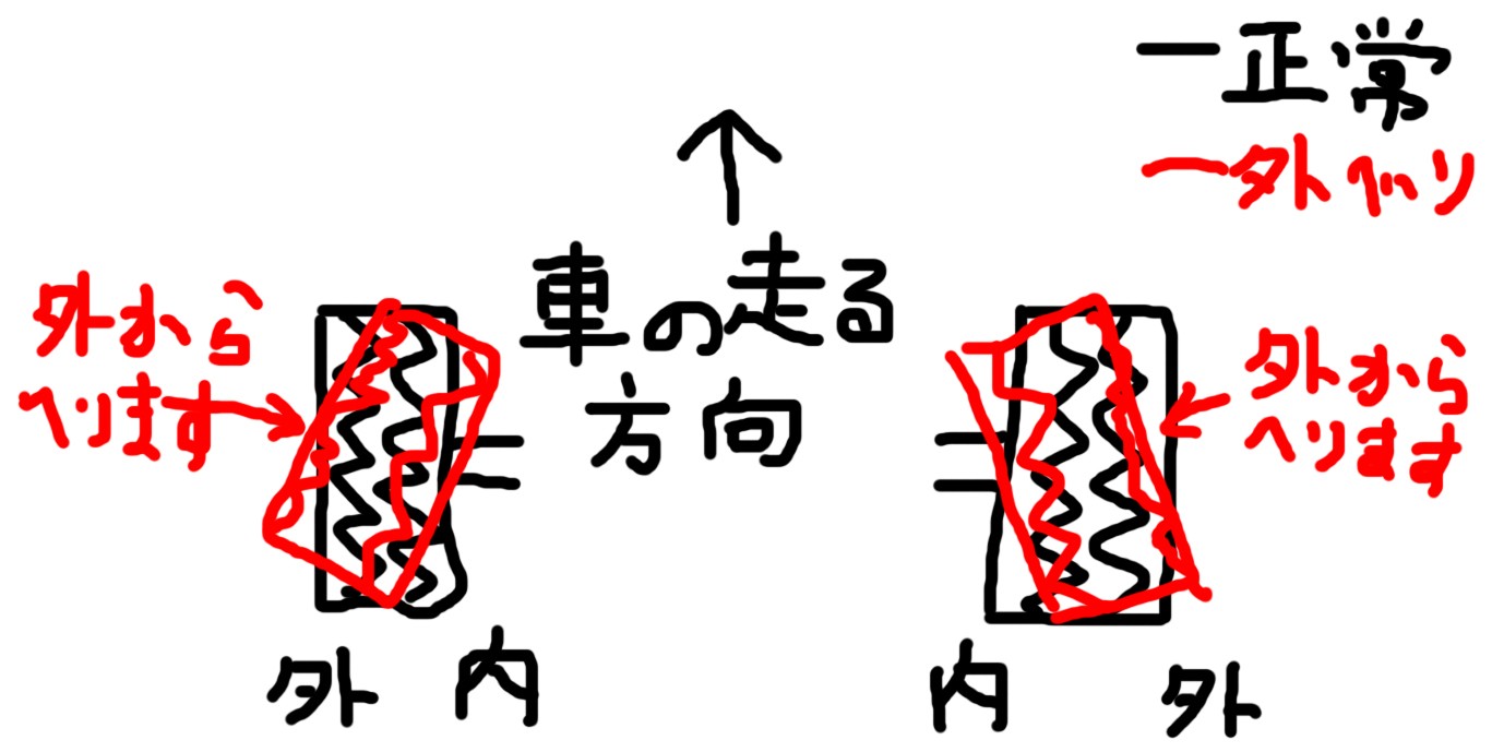 通常タイヤは外側と内側の減り方はそこまで差は出ません。