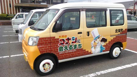 北栄町役場 ポスト 2015年7月6日 今日は仕事で北栄町役場の北条庁舎に行きました。北栄町は名探偵コナンの作者 青山剛昌先生の出身地ということでいろいろなところにコナンが使われています。役場の公用車もラッピングされていました。ホイールカバーにもキャラクターが描かれています。これならコナンに会えるまちがしっかりPRできますね!北栄町はコナンのマンホールのふたもあるし、オブジェもたくさんあります。興味のある方はぜひ行ってみてください! 担当:永田