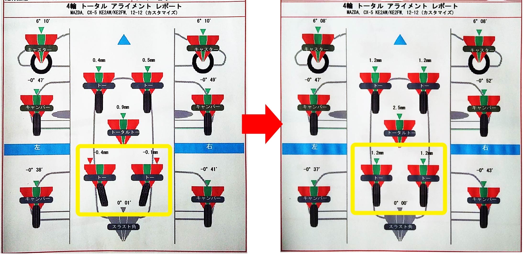 後ろがかなりのトーアウト((+_+))。早速調整して、規定値に合わせました。