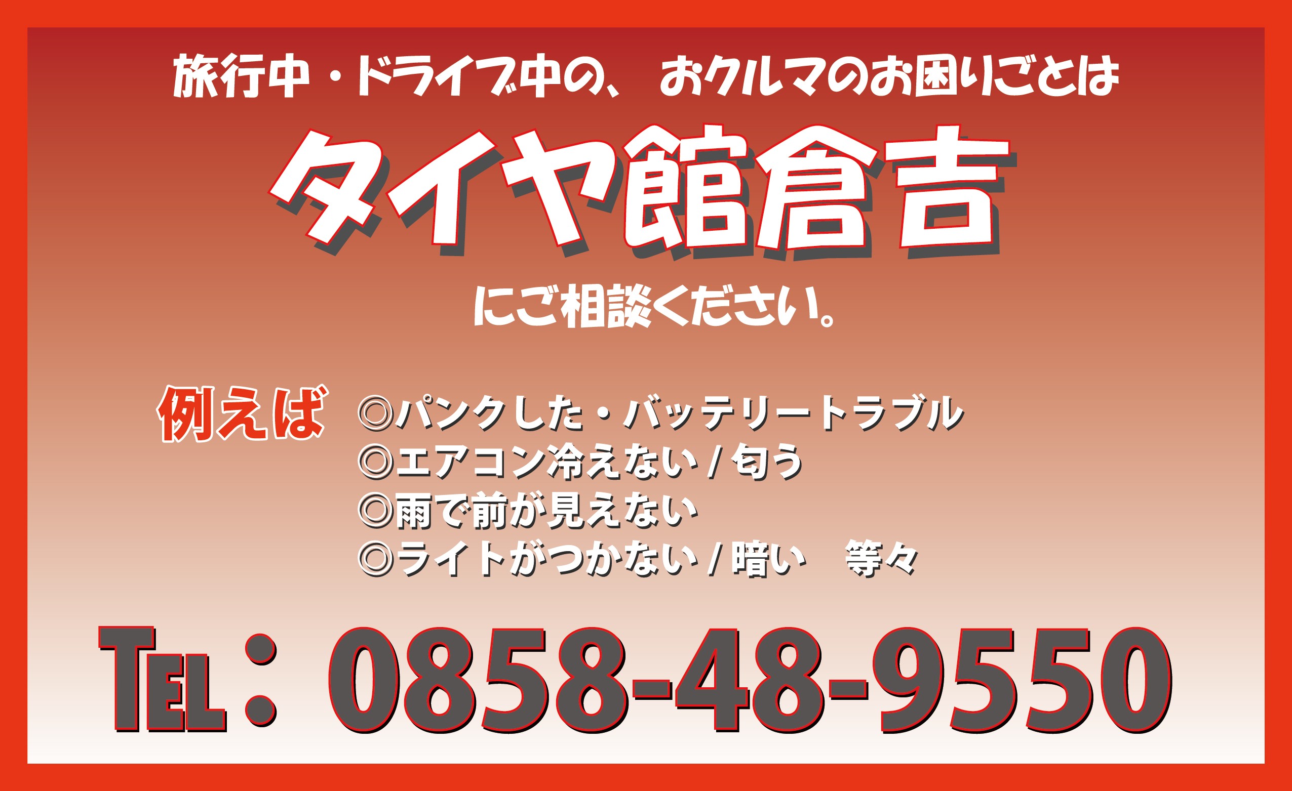 旅行中・ドライブ中のお悩みはタイヤ館倉吉まで!