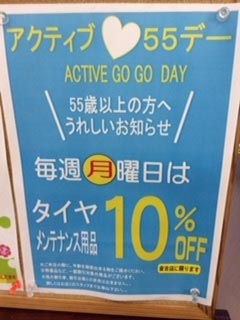 毎週月曜日は ポスト 2015年7月19日 タイヤ館倉吉をいつもご利用ありがとうございます。このたびタイヤ館倉吉では毎週月曜日にー 「アクティブ55デー」を始めることとなりました。明日です!画像見たままですが毎週月曜日は55歳以上の方にタイヤ 10%OFFメンテナンス用品 10%OFF です(^^)是非是非ご利用くださいー♪ただし一部商品は除きますので、詳しくはスッタフにお聞きください<(_ _)>☆ご来店をスタッフ一同お待ちしております☆ 担当:居川