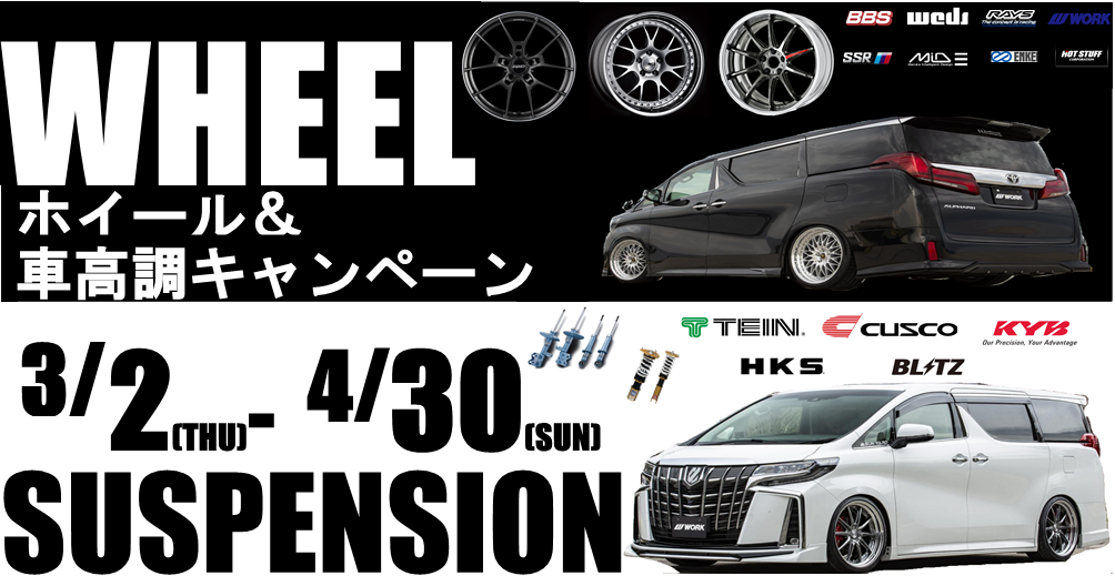 今回は、昨年も大好評でした、アルミ&車高調キャンペーンの概要についてご案内します☆彡
