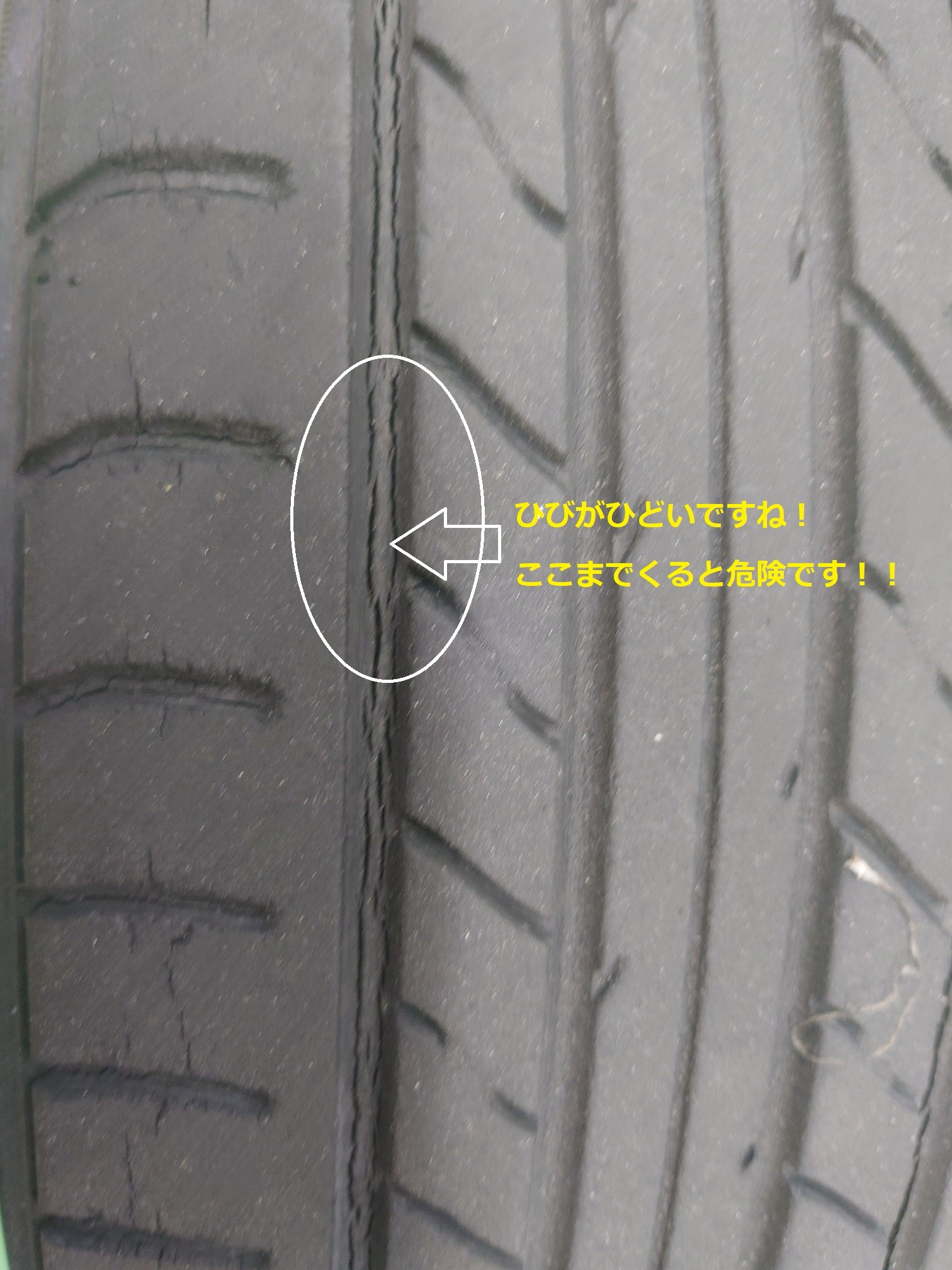 タイヤは古くなると少しづつひびも入りますが、深いひびになると