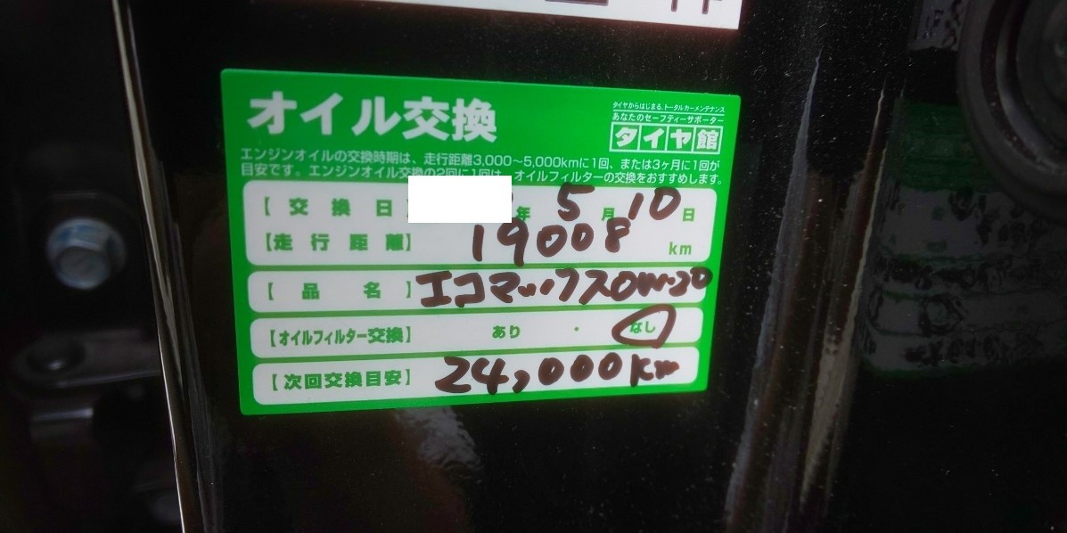 写真のようなオイル交換の記録されたシールが貼ってあることが多いです。これはタイヤ館でオイル交換された際に貼っているオイルシールです。