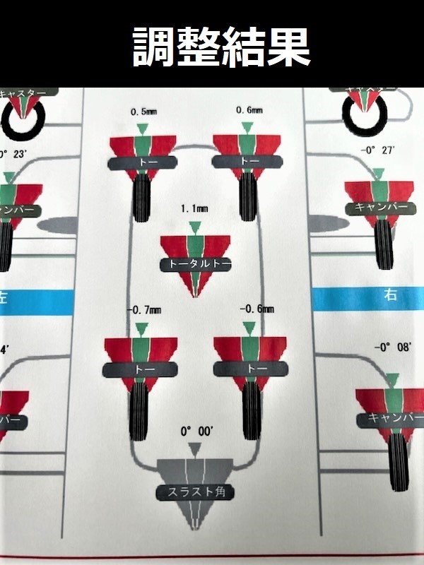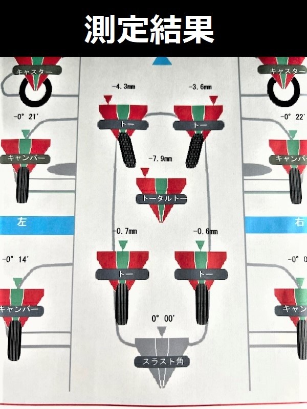 タイヤが左右とも、がに股のように開いてしまっていますね。