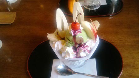 話題のパフェはバニラや抹茶アイスやフルーツが盛られたパフェグラスに、