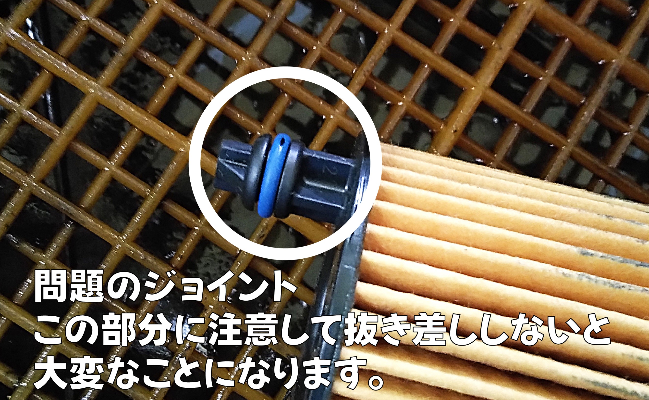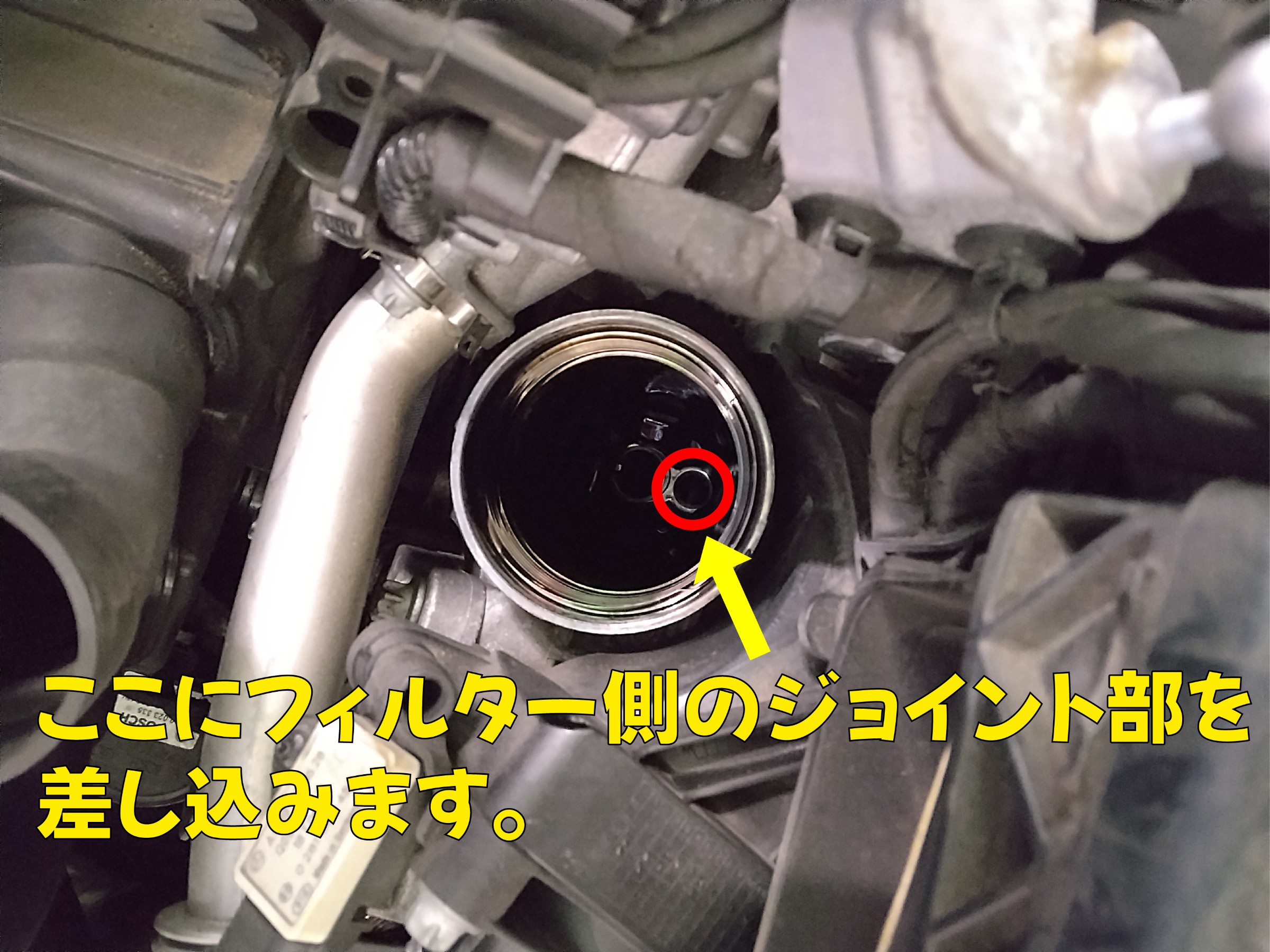 必ず新しいフィルターのジョイント部分がエンジン側の受け部分に刺さるようにしてください。