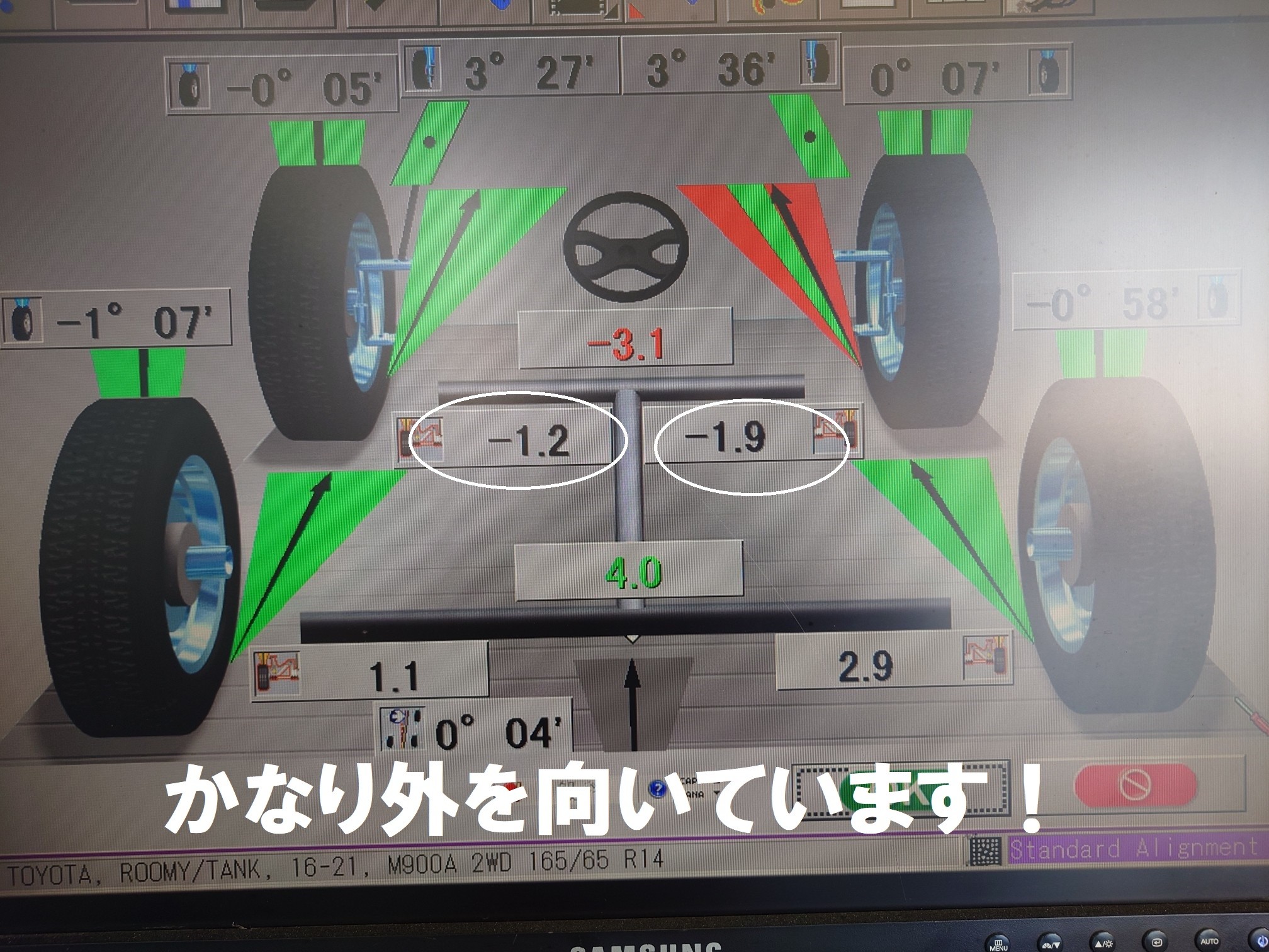 明らかにタイヤの取り付け角度がずれてしまっています。