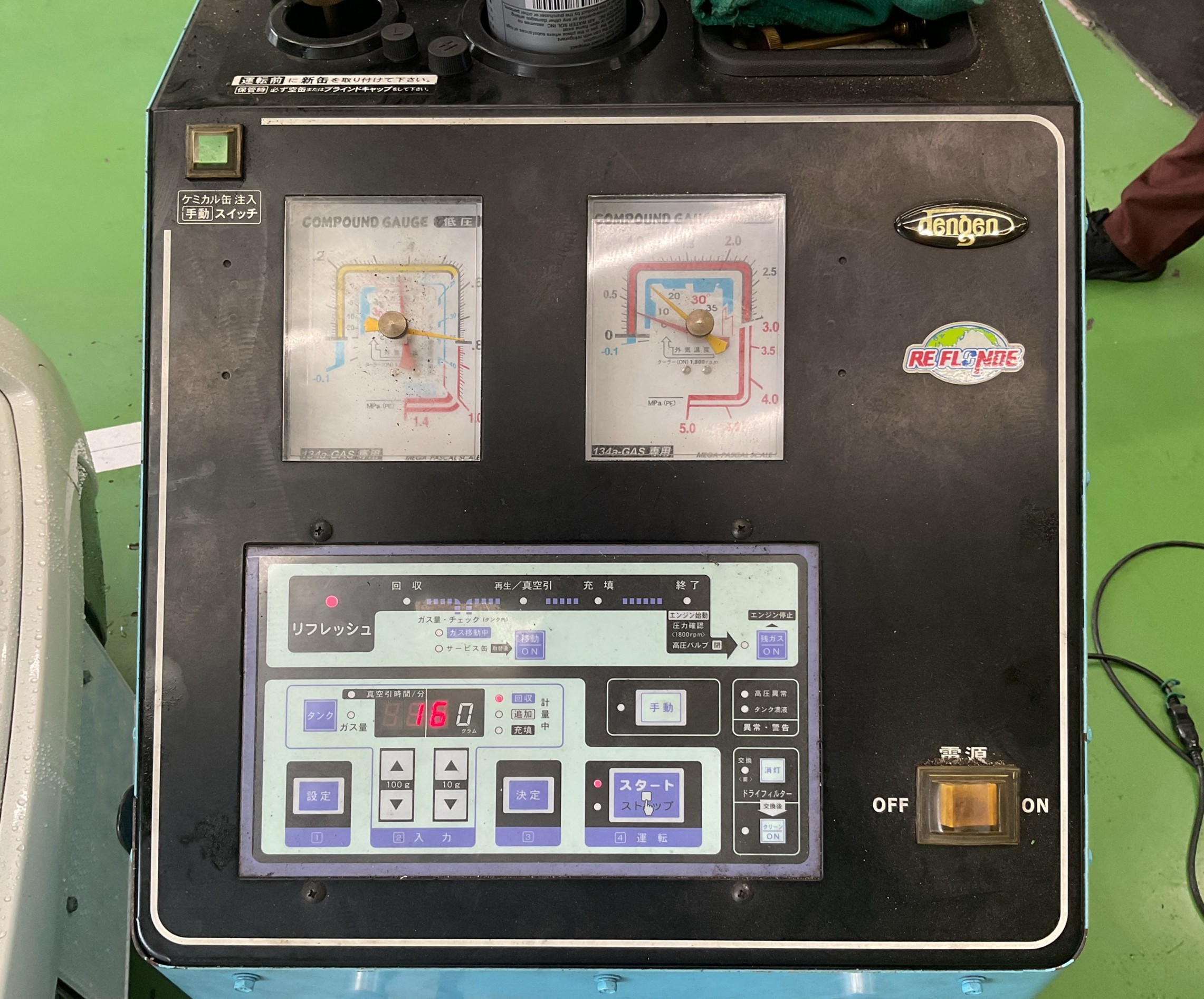 ①クリーニングマシンで一度車側のガスを全て回収します。