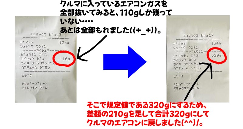 早速ラインからエアコンガスを一度抜いてみて、どれくらいのガスが残っているかをチェックしたところ