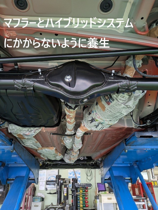 お車を1日預かって下回りを清掃してから、マフラーやハイブリッドシステムやボディーやブレーキ周りにかからないように養生しました。