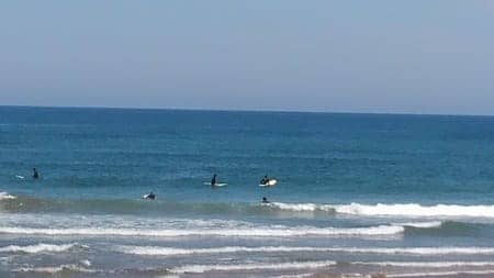 体長2メートルほどのバンドウイルカがサーファーに近づいてきて