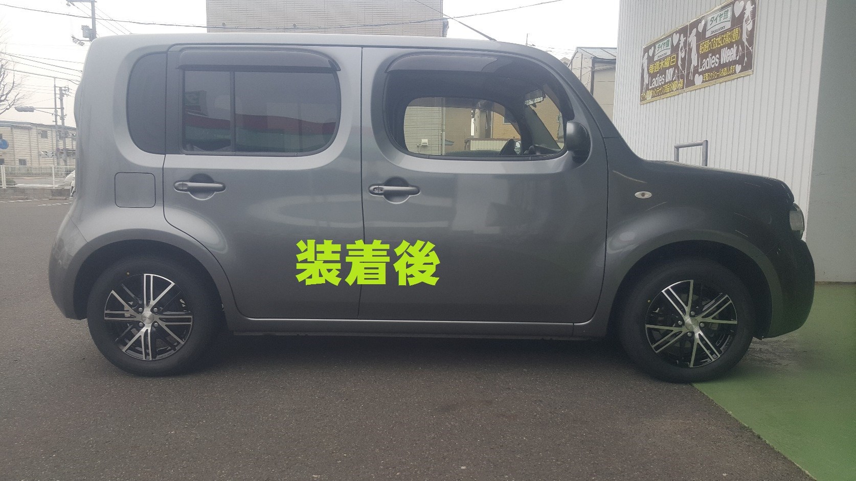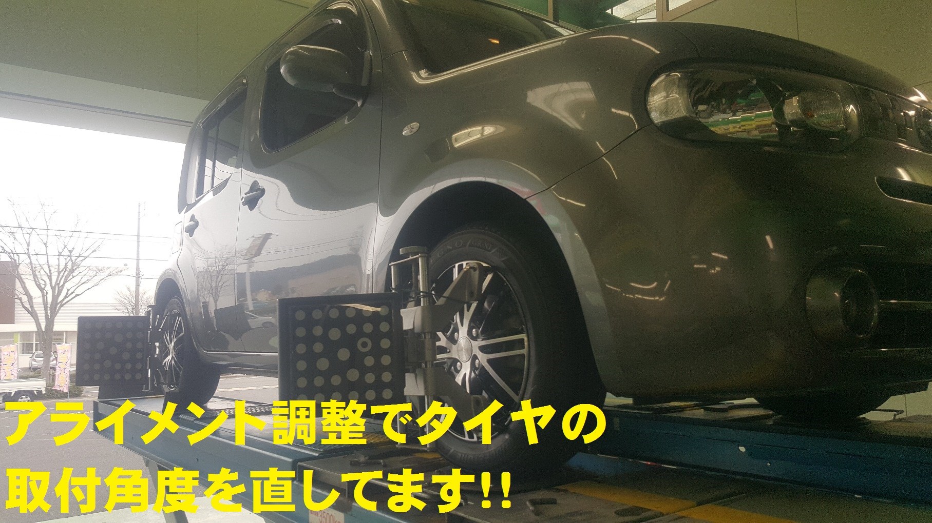 キューブのお客様に、タイヤ交換とアライメント調整を