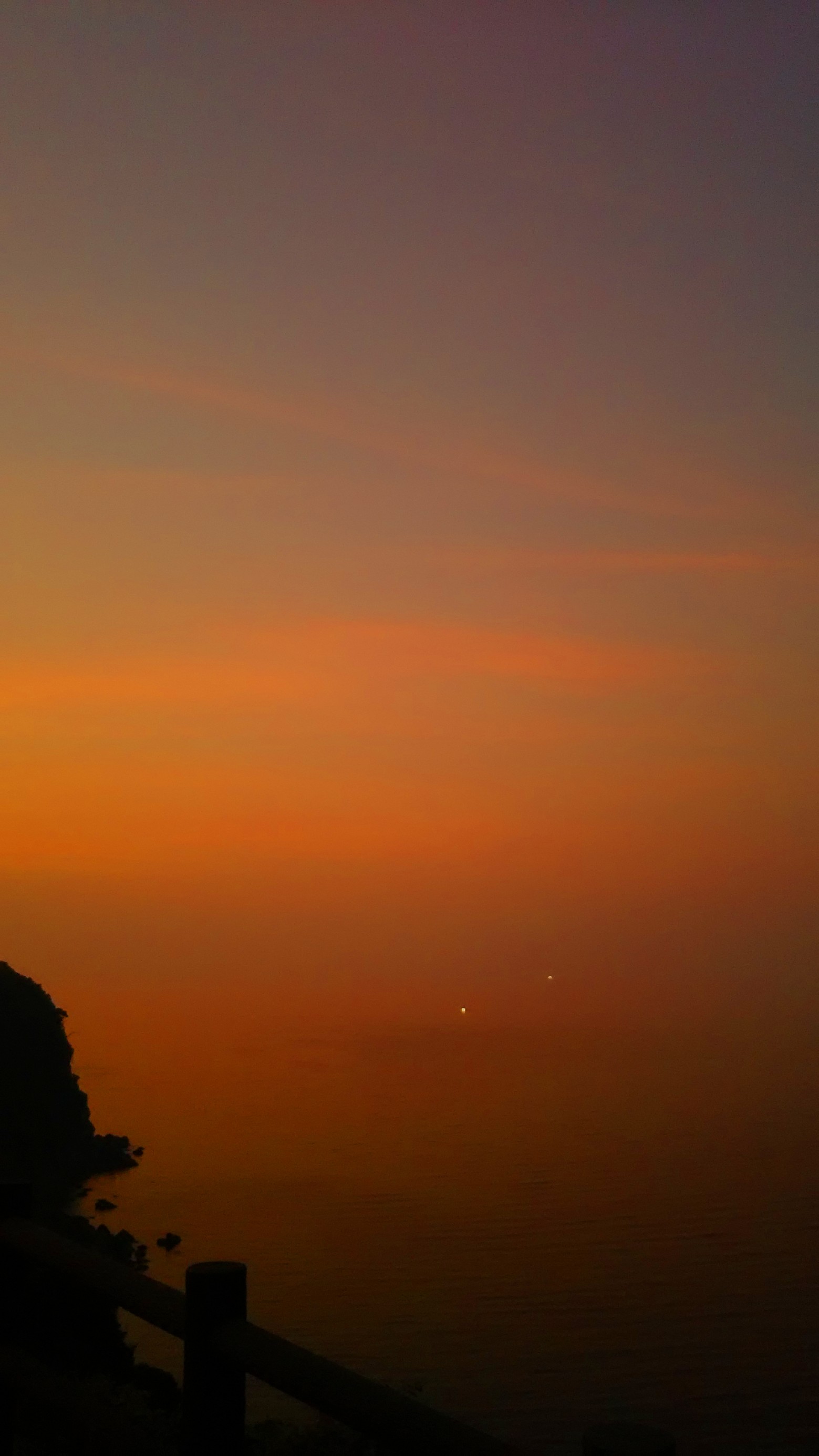 夕陽が日本海に沈み、沖合には漁火が灯り始めています。