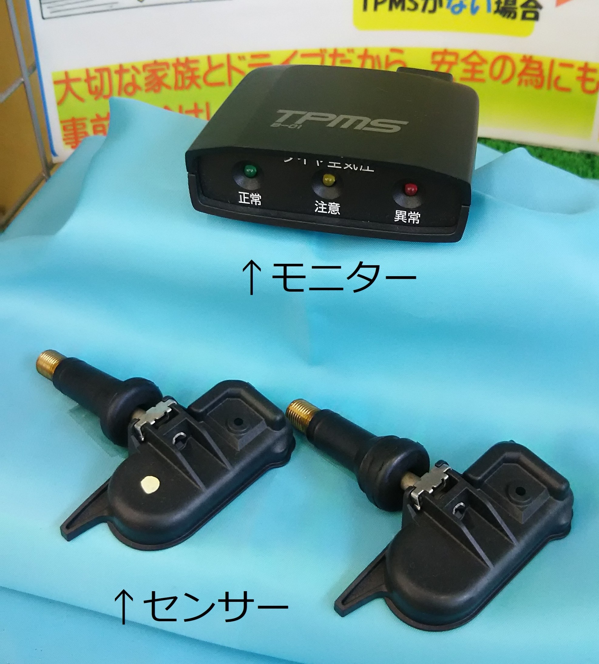 タイヤに下の写真のセンサーを取り付け、車内に写真上のモニターを取り付けます。
