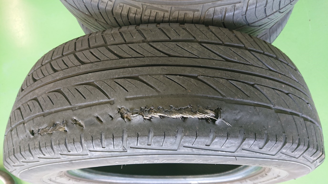 セパレーション ポスト 2018年11月6日 先日タイヤ交換でお越しのお客様のタイヤがすごいことに なっていました。 タイヤのトレッド(接地面)が変形してコード(ワイヤー)が露出! 少し前から変な振動を感じていたそうですが、そのまま走行を 続けたために膨らんでいたところがどんどん減って、 ついにコードが出てバースト寸前! 完全にコードとゴムが剥離していました。 高速走行中にバーストすれば事故になるかもしれません。 こうなる前にしっかり点検しましょうね! 担当:永田