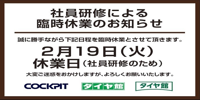 臨時休業のお知らせ ポスト 2019年2月14日 明日、2月19日(火)は社員研修のため 臨時休業とさせていただきます。 2月20日(水)は通常定休日となります。 ご迷惑をおかけしますが、なにとぞご了承お願いします。 カテゴリ:お知らせ