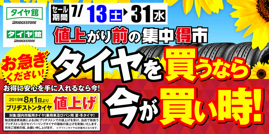 いつもタイヤ館倉吉をご愛顧いただきありがとうございます(*^-^*) 皆様にお知らせです。 2019年8月1日よりブリヂストンタイヤの夏&冬タイヤの価格が上がります。 物流関係費高騰による(株)ブリヂストンでの値上げを受け、当店で取り扱うブリヂストン及び セイバーリングタイヤの価格の値上げを実...