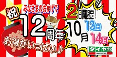 10月13日~10月14日で開催させていただきました、 12周年祭。 2日間共に天候にも恵まれ、本当にたくさんのお客様にご来店いただき、 スタッフ一同感謝申し上げます! 今後も、地域密着した店舗を目指し、タイヤの事なら タイヤ館と言っていただけるお店にしていきますので 皆様!これか...