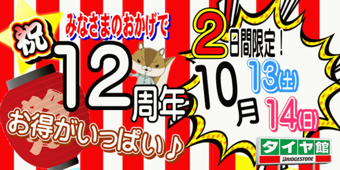 みなさまのおかげで、タイヤ館倉吉店はOPEN 12年!!10月13日(土)~10月14日(日) 2日間限定!で12周年祭を開催いたします(^^)V豪華景品が当たる抽選会や、夏タイヤ・冬タイヤを特別価格で大放出★もちろん、メンテナンス商品や各種コーティング も割引しちゃいます♪ お子様へのお菓子プレゼント...