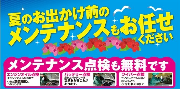 8月の定休日をお知らせいたします(^^) ◇8/2(水) ◆8/9(水) ◇8/16(水) ◆8/23(水) ◇8/30(水) お子様が夏休みで、家族で旅行や海に出かけたり、 お盆で帰省したり・・・お出かけが多くなる8月!! お出かけ先で車がトラブルにならないように 愛車の安全点検をされませんか☆ もちろん無料で点検...