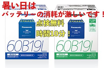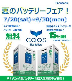 7/20(土)~9/30(月)まで パナソニック「caos(カオス)」 夏のバッテリーキャンペーン 開催中です!! 期間中、パナソニック製バッテリー『caos』シリーズが 店頭表示価格より、なんと! 【15%OFF】!!!! 高性能なバッテリーが、お買い得に交換できる、チャンスです!! この夏、愛車の...