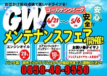ゴールデンウィーク前にメンテナンスフェアを開催します。 間もなく楽しい楽しいゴールデンウィーク! そんな楽しいお出かけ前にお車の無料安全点検をオススメします。 メンテナンス用品も オイル20%オフ、 バッテリー15%オフ、 エアコンフィルターとワイパーは10%オフ、 となっていますので、お...