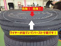 先日県外ナンバーの車がご来店されました。 タイヤを見てみるととても危険な状態でした! タイヤはいきなりこんな状態になることはありません! 日頃から点検しているとこうなる前に築くことができます。 こうなる原因は足回りの狂いや、タイヤの空気圧不足、タイヤの強度不足、 傷からのコード(ワ...