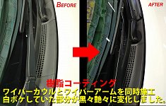 いつもご来店いただくお客様がご来店。 前回のオイル交換で少し樹脂の白ボケが気になっていたので 樹脂コーティングの施工をご案内していたのですが、 お客様も気になっていらっしゃったみたいで、施工にご来店いただきました。 今回はワイパーカウルとワイパーアームを施工。 施工後は黒々艶々と、...