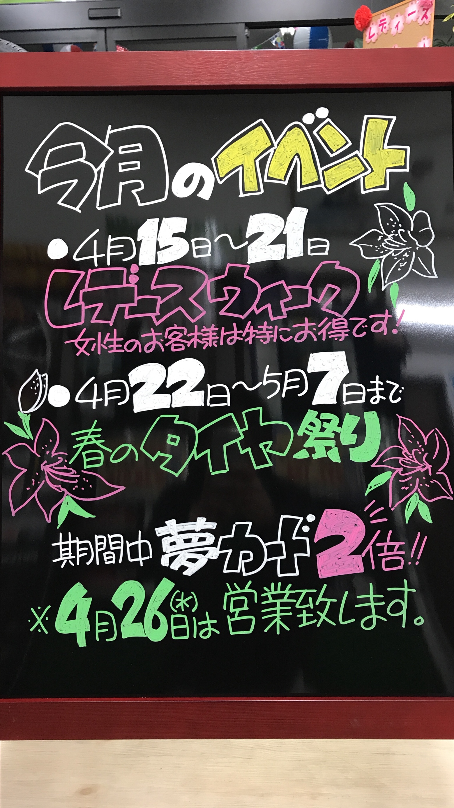 レディースweekヾ(´︶`♡)ノ ポスト 2017年4月15日 今日から4月21日の土曜日まで、 タイヤ館久留米で女性にお得な1週間! 「レディースweek」開催します٩(๑•∀•๑)۶ 期間中はメンテナンス系がお得ですꉂ(ˊᗜˋ*) さらに、夢ポイントも2倍٩(。•ω•。)و またまた購入のお客様にはプレゼントも用意してます♪ 奥さん、恋人、ご友人とご一緒でもOKですヾ(´︶`♡)ノ たくさんのご来店をお待ちしております!