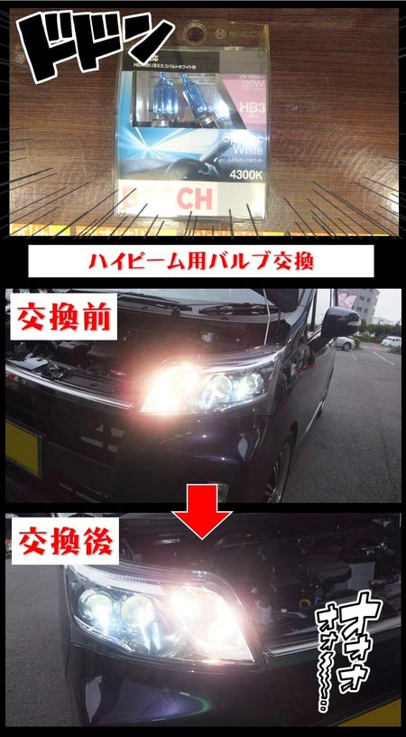 最初は両方ともLEDバルブにする案もあったのですが、保安基準に対応するハイビーム用LEDバルブはなかなかの高額。スモールランプはハイビームのバルブに場所が近く、熱でLEDの寿命が短くなり、メーカー保証が効かないとの事でオーナー様と相談した結果、両方とも高効率のハロゲンバルブに交換しました。