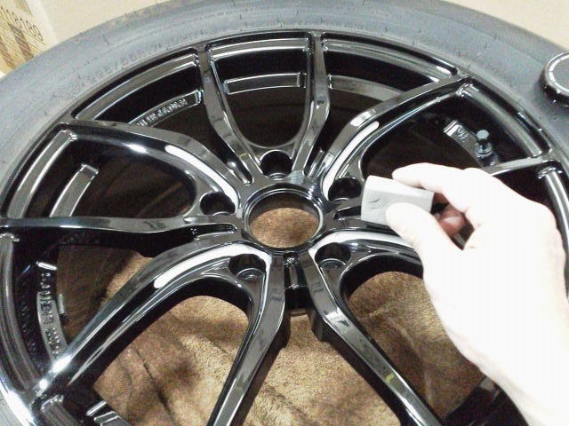 作業はコーティング剤を専用スポンジでホイールに塗り広げ、クロスで拭きあげる、といった単純作業なのですが、コーティング剤の硬化時間が早く、施工ムラにならない様にキレイに仕上げるには集中力が必要ですね。