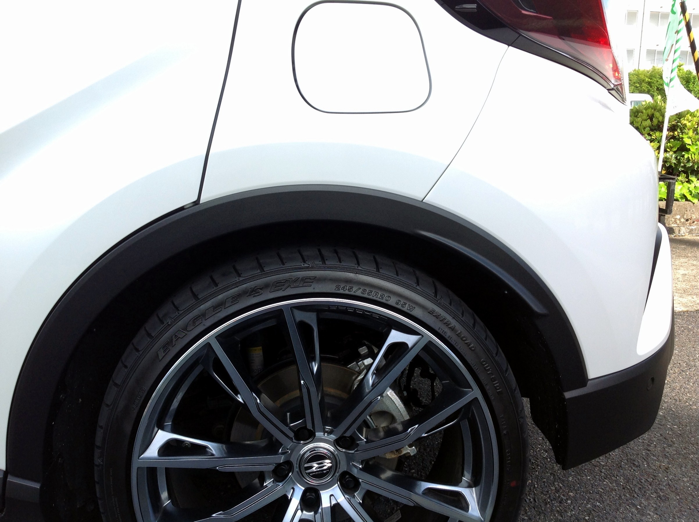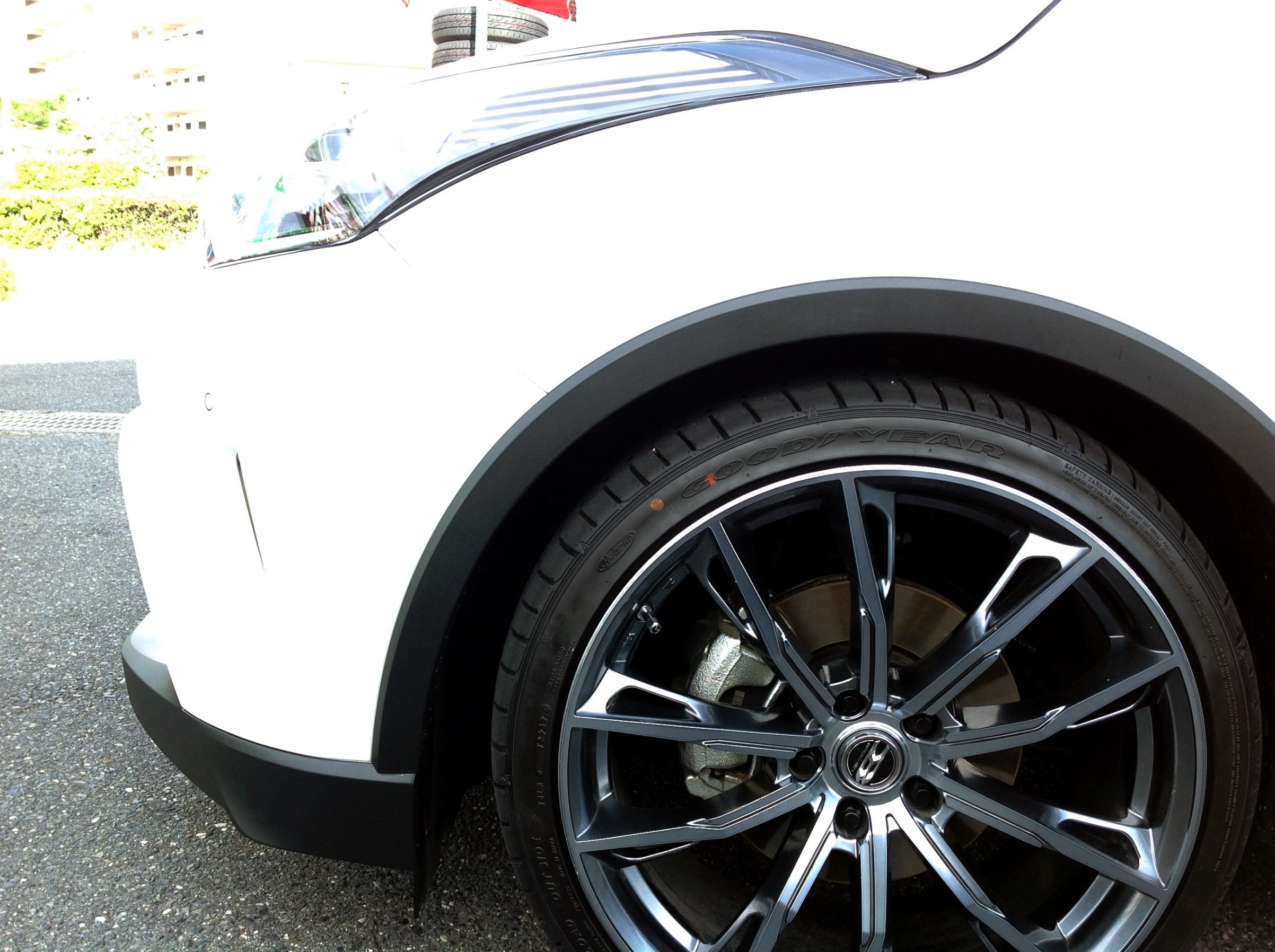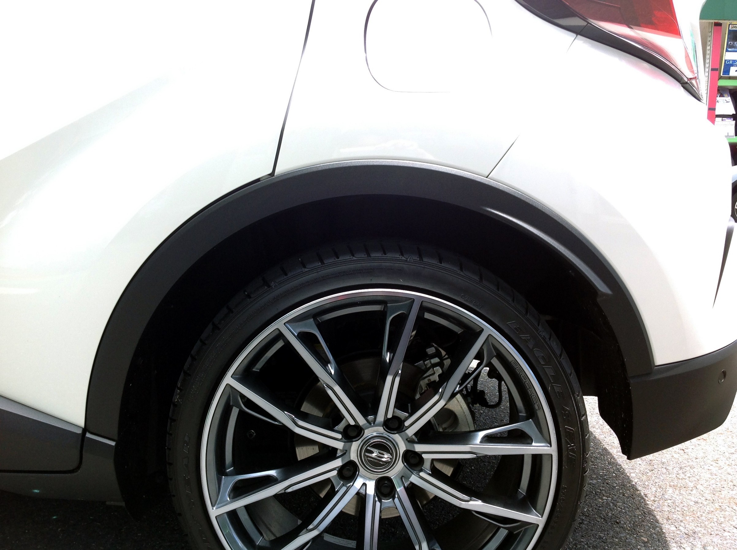 車体の大きさからすると迫力を出すには20インチがベストですが、タイヤハウス内の寸法に余裕のないこの車はホイールの選択肢が限られるうえ、基本チューナーマッチング(ローダウン前提)となります。