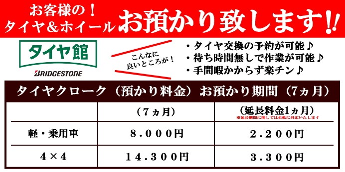 タイヤ&ホイール保管サービスのご案内♪ ポスト 2022年11月26日 こんばんは♪ 冬タイヤ交換も少しずつ落ち着いてきました♪ そこでご案内です!! タイヤ交換後の ・タイヤの保管場所 ・持ち運びが大変 ・車に積めない などなどお困りの方に当店サービスのご案内です。 タイヤクローク(タイヤの保管)です!! 詳しく詳細が知りたい方!少しでもお悩みでしたら 是非!タイヤ館釧路店までご連絡お待ちしております♪