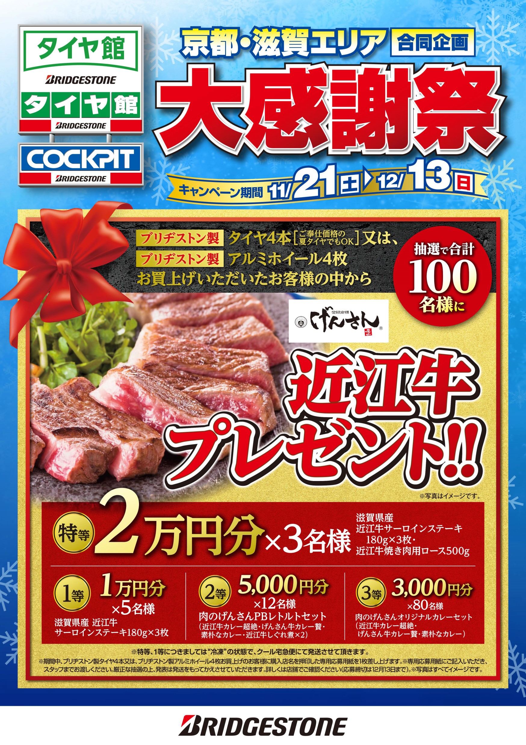 なお12/13までにタイヤ4本(夏・冬)をお買い上げいただいたお客様には抽選で近江牛をプレゼント!!
