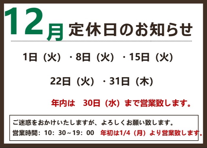 ☆12月定休日のお知らせ ポスト 2020年11月30日 いつも当店のWEBをご閲覧いただき誠にありがとうございます! 12月定休日は以下の通りになります。 29日の(火)は営業致します。 お客様には大変なご迷惑をおかけしますが、何卒ご理解賜りますようお願い申し上げます。