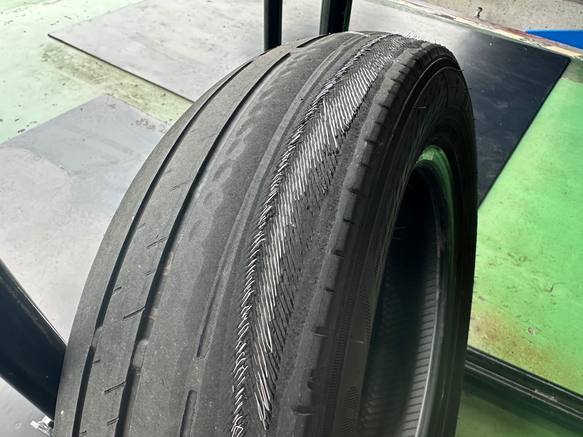 これはタイヤの内部構造が露出しており、大変危険な状態です。