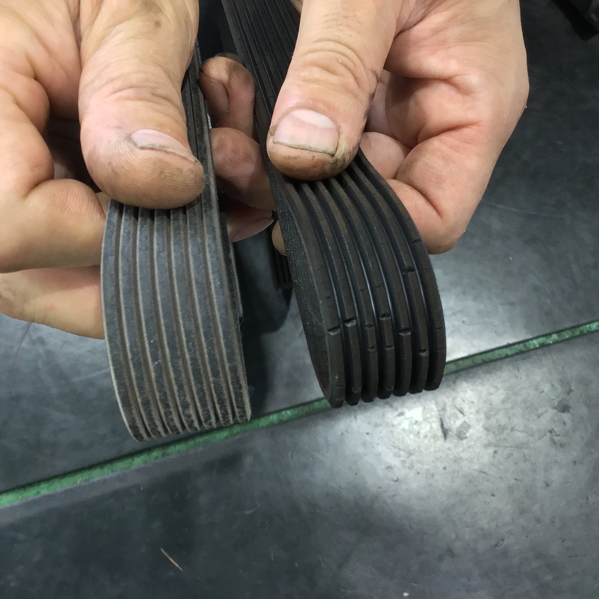 左のベルトが新品、右のベルトがひび割れてしまっているベルト