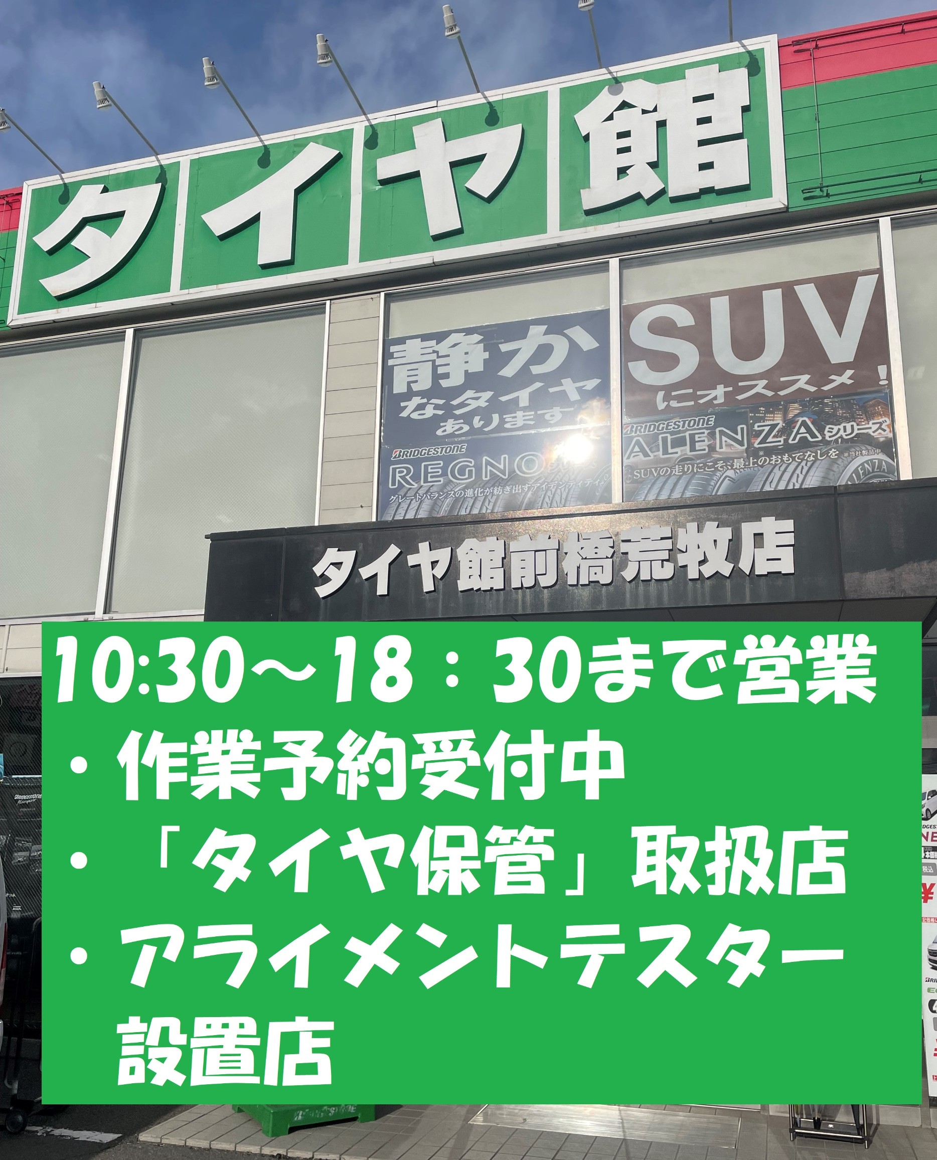 【9月8日(日)】 2024年9月8日 タイヤ館前橋荒牧店のwebサイトをご覧いただきありがとうございます。 本日も【10:30から18:30まで営業】 皆様のご来店、お待ちいたしております。 【開催中のイベント】 ・タイヤ館 プレミアムタイヤセール 9/22(日)まで開催 ・スタッドレスタイヤ 早得キャンペーン 11/30(土)まで開催 【本日の予約状況】 どの時間帯も、空いております。